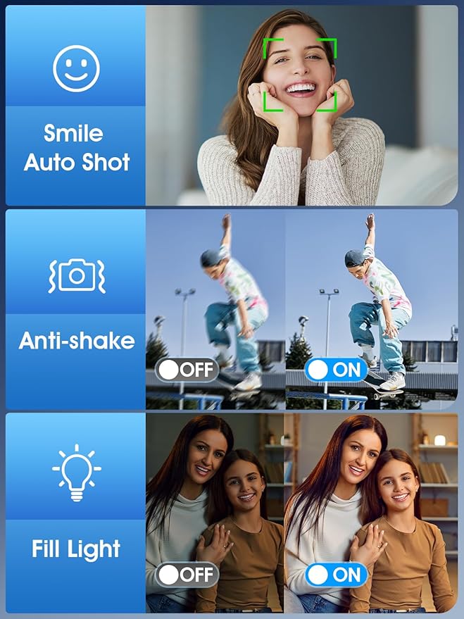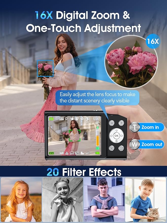 • 【16X Digital Zoom & Versatile Shooting Modes】 Want to capture distant landscapes or zoom in on wildlife? With 16X digital zoom, this camera allows you to bring distant subjects into focus with ease. The built-in image stabilization ensures your photos are steady and sharp. Features like smile capture, continuous shooting, and self-timer make it the perfect choice for documenting family gatherings, friend parties, and other joyful moments.