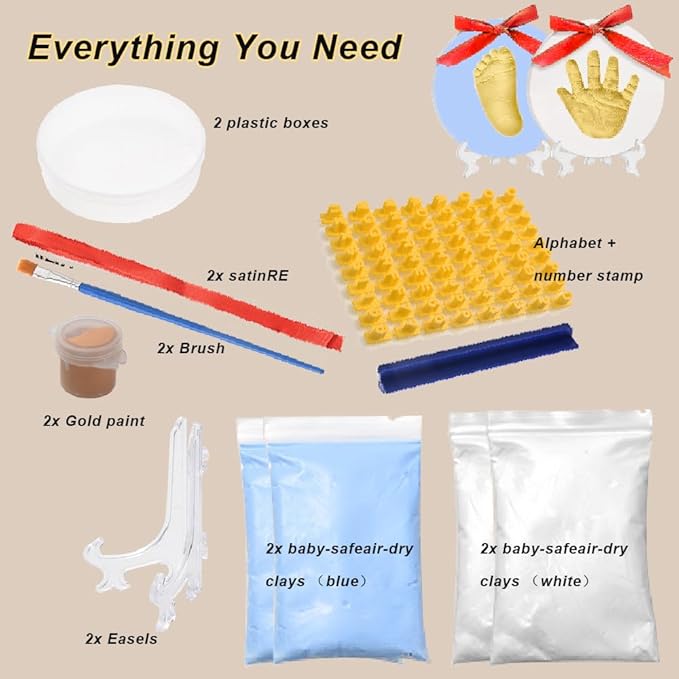 • Baby Handprint Ornament kit: Includes 4 packs of clay for footprint or hand mold, (2 white and 2 blue,makes 2 keepsakes of 4" diameter, or 1 larger keepsake), 2 Plastic Cutting Rings of 4" diameter, 2 Plastic Easels, 2 Plastic Straw Hole Punch, Ribbons in Red.paints, and paintbrushes.Hand print ornament kits for babies, baby footprint ornament kit, baby first Christmas ornament, keepsake ornaments.