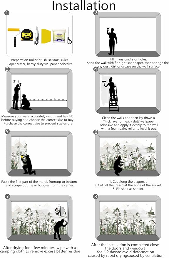 • Installation Steps1. Fill in any cracks or holes and clean the surface of the wall of dust, dirt and grease.2. Apply heavy-duty wallpaper paste to the wall, not the mural.3. Mark the position of each strip of wallpaper with a spirit level.4. Align the pattern and slide it into place.5. Scrape the bubbles with a spatula.6. Let it dry for a couple of minutes and it's ready to go!