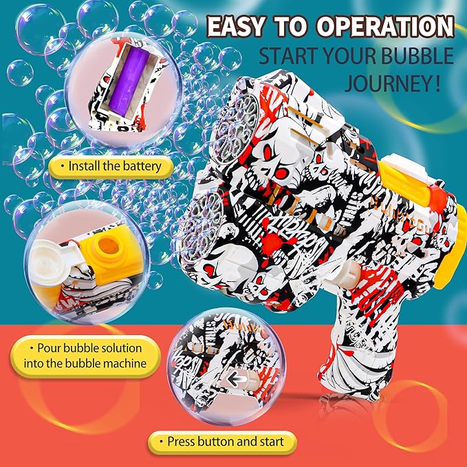 • LED Colorful Bubbles - The bubble machine blower has built-in LED lights, and the dreamy lighting effects make the bubbles more atmospheric and attractive. Whether during the day or night, the LED light bubbles gun brings a different kind of fun experience to children. The bubble machine has a super long-lasting battery and is easy to charge, allowing children to have uninterrupted bubble blasting fun!