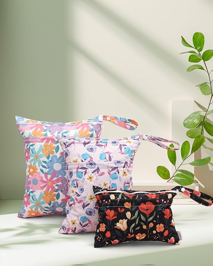 ALVABABY 3 Cloth Diaper Wet Dry Bags Waterproof Reusable with Two Zippered Pockets Travel Beach Pool Daycare Soiled Baby Items Yoga Gym Bag for Swimsuits or Wet Clothes Small medium Large 3L-SML07
