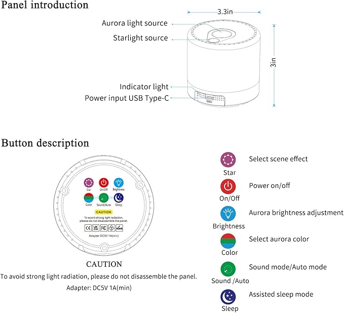• AUTO MODE / SLEEP MODE / TIMER MODE / VOICE CONTROL: When adjusting the Galaxy Projector to Auto Mode, you can set your favourite lighting effects, and when you don't turn off the projector, the Galaxy Projector will always keep the lighting effects. When sleep mode is turned on for ten minutes, it will adjust to breathing mode and turn off automatically after about one hour. The Galaxy projector has an auto power off timer mode, use the remote control to set it to 0.5H/1H/2H/3H/4H after switching off, the projector will automatically switch off. When the voice-activated mode is turned on, the Galaxy projector's lights will change to the rhythm of music, clapping and stomping.