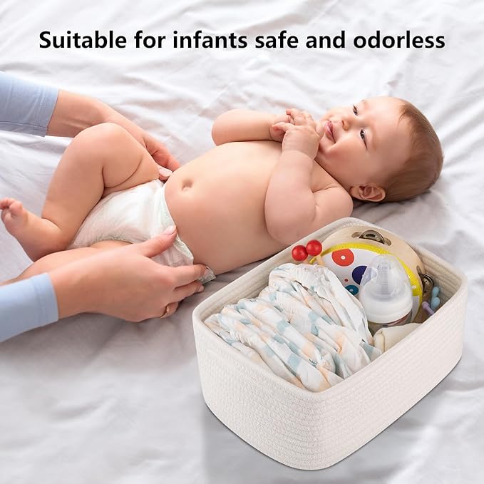 • [Premium Cotton Material]:Our cute baby storage baskets are made of high quality cotton hand-woven by workers, soft and odorless, no sharp edges and corners, very friendly to babies and pets, a good choice for baby-sitting baskets and dog or cat toy baskets