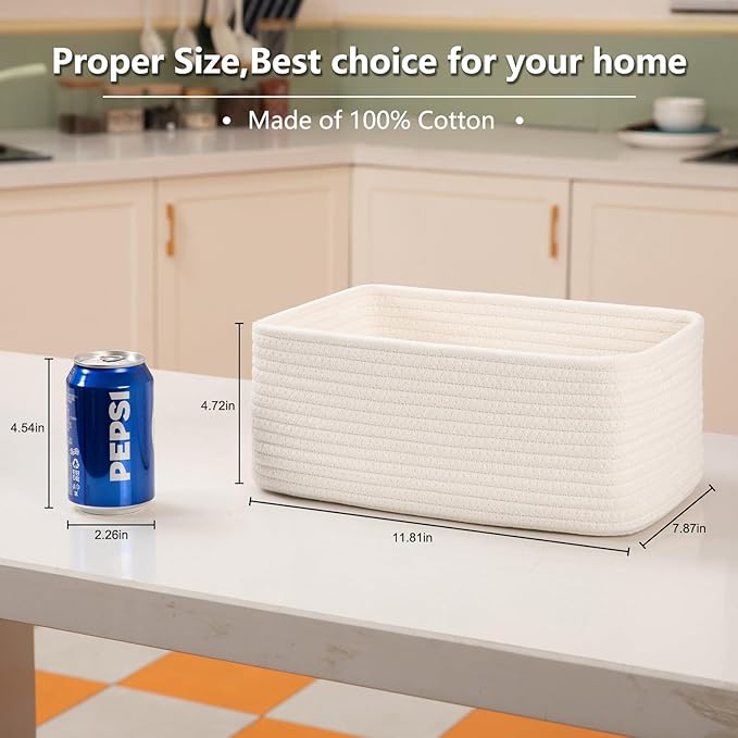 • [Cute & Small Decorative Storage Baskets]: These 4 Pack woven baskets measuring 11.81” x 7.87” x 4.72”, the fantastic woven rope baskets with mini size, which can work as shelf baskets for organizing, cute and practical for home decor, making your home more cozy and attractive