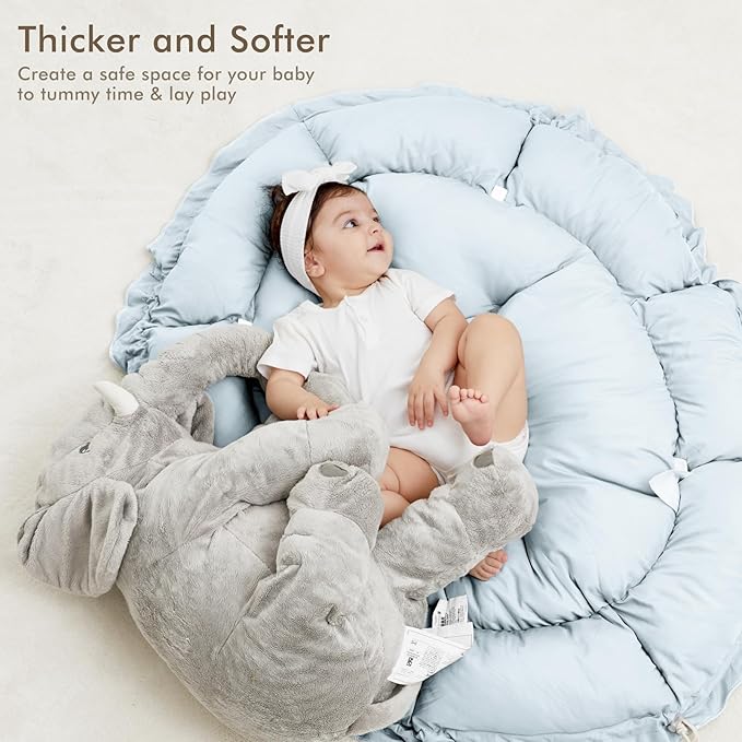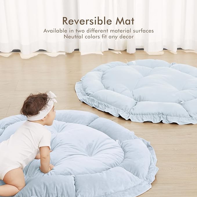 • THICKER & SOFTER: The reversible play mat crafted from premium plush material, offers a fantastic amount of cushion. Its neutral color scheme blends in with your home’s aesthetic so you can keep it out even after playtime is over.