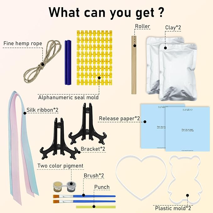 • Set Includes:Two pieces of air dried clay, roller, straw, 2 paint brushes, 2 ribbons, additional custom template kit, 2 display stands, 2 colors of paint.Grey and gold.Everything you need to make beautiful, lasting footprints or paw prints souvenir ornaments to display on your mantel or hang on your Christmas tree.