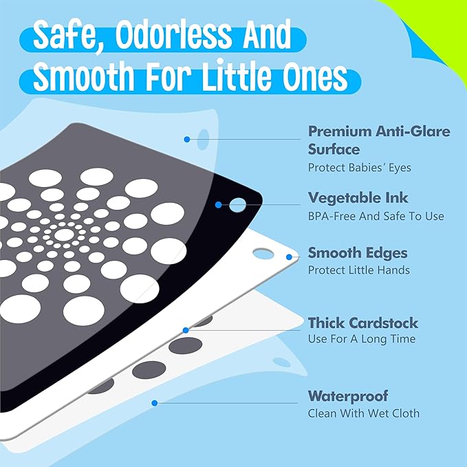• Premium Quality: It is made of thick paper material and coated with anti-dazzle film, easy to recognize and protect babies’ eyes well. Printed with premium vegetable oil-based ink, BPA-Free and safe to use. The rounded corners and smooth edges are safe enough for babies’ small hands to grab it.