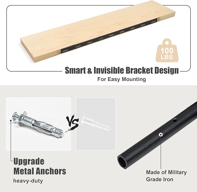 • Sturdy & Functional: Equipped with heavy-duty metal brackets, each shelf supports up to 100 lbs. The flat surface and stable construction make them suitable for any room while showcasing the natural beauty of the wood grain.