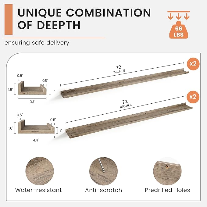• 【Picture Ledge Perfect for Display】FLYJOE picture ledge shelves for wall turn your walls into a stunning photo gallery! These spacious shelves are ideal for showcasing a variety of picture frames in one secure place. With a thoughtful protective lip, you can display everything from photos to collectibles without worrying about them falling off
