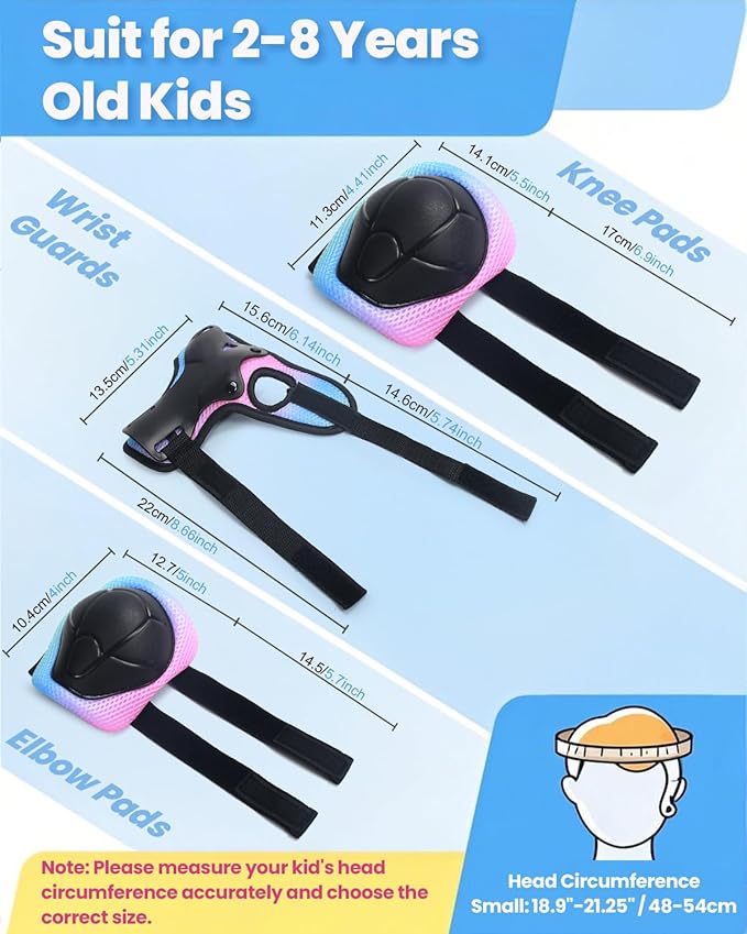 • 7PCS Kids Helmet and Protective Gear Set - Includes 1 adjustable helmet, 2 knee pads, 2 elbow pads, and 2 wrist guards—everything your child needs for safe riding. Built with a tough, scratch-resistant PP shell and cushioned interiors for long-lasting protection and comfort.