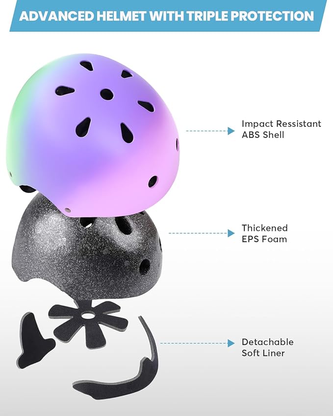 • Ventilated & Sweat-Absorbing Comfort - Equipped with 11 air vents and breathable, removable interior padding that helps absorb sweat and improve comfort. Keeps kids cool and dry during biking, skateboarding, scootering, rollerblading, and more.