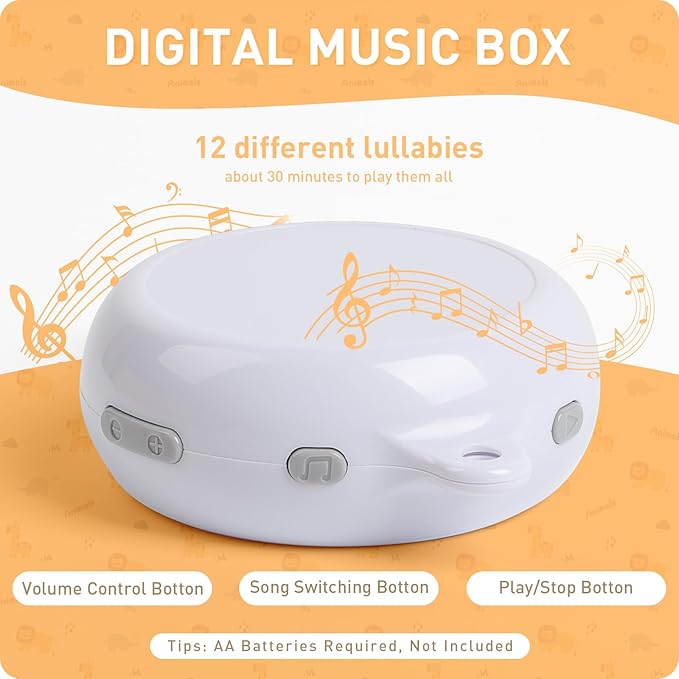• 12 Different Lullabies: There are 12 different lullabies, you can easily change the song and ajust the volume level.