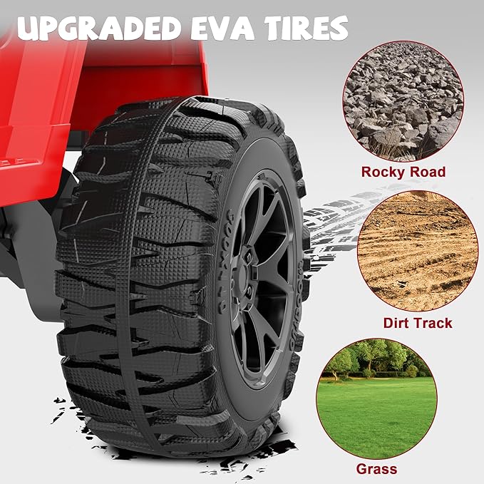 • [Conquer Any Terrain] The ride on car's 4 large-diameter EVA explosion-proof tires offer better traction, wear resistance, anti-slip properties and durability compared to ordinary plastic tires, making this off-road kids ride on toys can conquer most types of roads, such as sidewalks, grass, or gravel. Its excellent suspension system will reduce bumps and vibrations, providing a comfortable ride to the little drivers. Whether playing or exploring, this kids electric car empowers kids to confidently tackle the outdoors, turning every journey into an exciting adventure