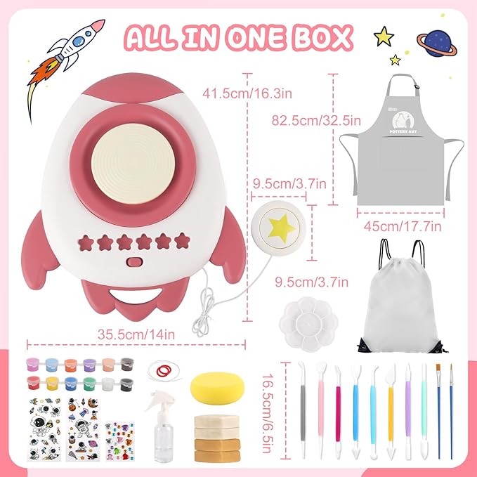 • Complete Pottery Wheel Kit for Kids: This mini pottery wheel set comes with 4 packs of air-dry clay, 12 vibrant paints, 2 brushes, sculpting tools, a sponge, a palette, an apron, a storage bag,a cutting wire, and fun stickers. A one-stop shop to meet your kids creative needs from shaping to coloring and to stimulate artistic potential. Create your own original piece of artwork