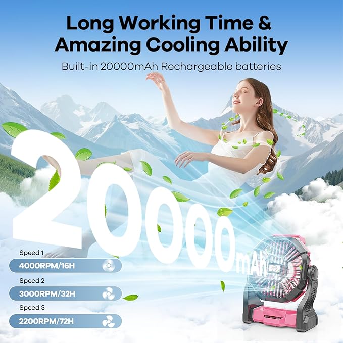 20000mAh Portable Battery Powered Camping Fan - with LED Light, Quiet Battery Operated, Camping Gear for Travel, Tent, Beach, Car or Hurricane Power Outages, Pink