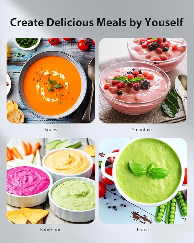 • 【4 in 1 Hand Blender】Our hand blender comes with a whisk, beaker, and chopper, making it incredibly versatile for preparing a wide range of recipes. Whether you're making smoothies, pureeing vegetables, or tackling baking tasks, this all-in-one tool helps you achieve perfect results with ease. From blending to chopping and whipping, it’s designed to simplify your cooking experience and save you time in the kitchen.