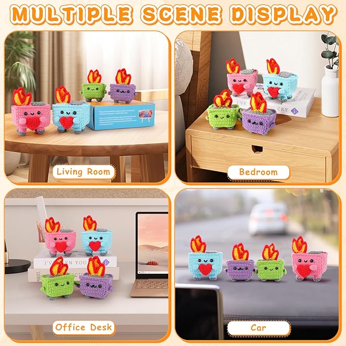 • CROCHET DUMPSTER FIRE: The crochet starter kit could crochet 4 cute dumpster fire(no card), loved by many. It will gently heal your heart as you crochet. The warm finished product can be used as a decoration and placed in the study room, living room, bedroom lamp, etc