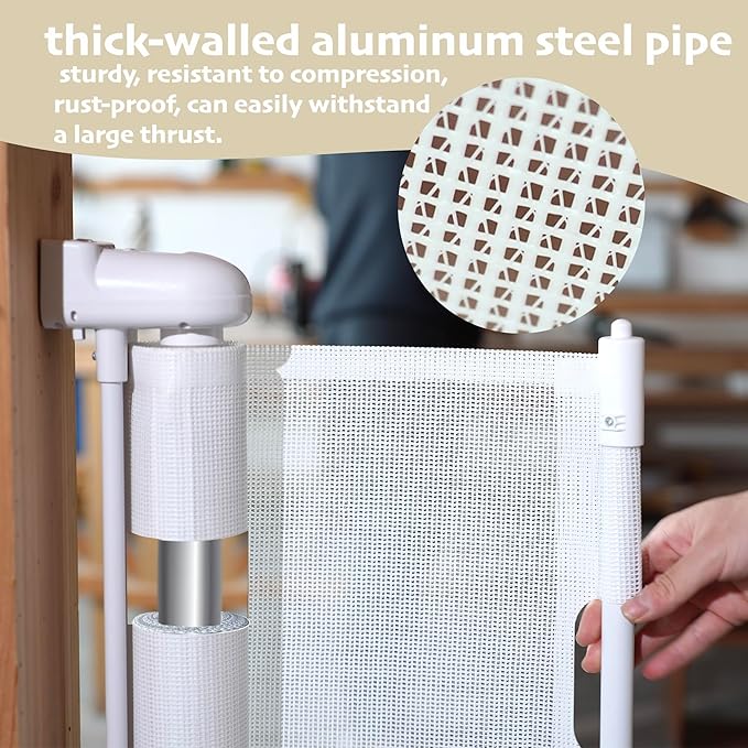 • Safety Double Lock Design - The retractable gate features two locking mechanisms: a mesh lock that controls the mesh's extension and retraction, and a hidden door lock for opening and closing the gate. Designed for adult convenience, it remains particularly challenging for children, effectively preventing them from opening the door alone and accessing hazardous areas.