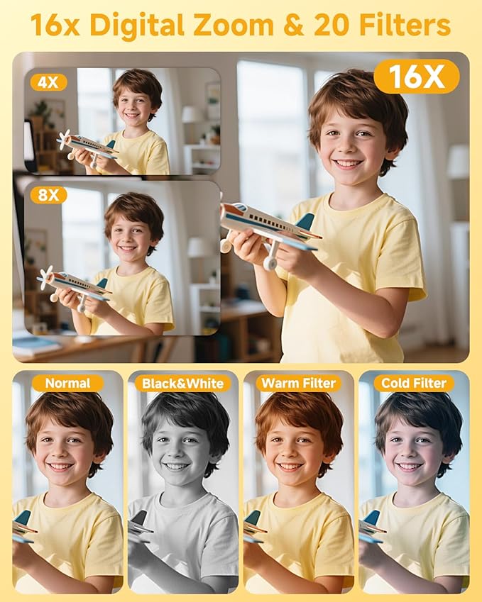 • 【16X Digital Zoom & Multi-function】:This kids digital camera not only supports 16x digital zoom(with a W/T button), but also support anti-shake, continuous shooting, face and smile detection, self-timer, and more.