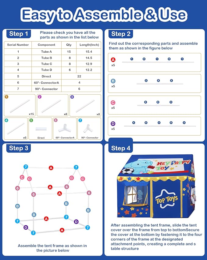 • Easy to Assemble: No tools are required, an adult can assemble the indoor tent in 15 minutes, this toddler playhouse come with a detailed step-by-step instructions. Whether indoors, in the backyard, or at the park, assembly is a breezeβ€”just press firmly to secure the poles and ensure a snug fit for the fabric cover. Come and build a small house with your kids today!