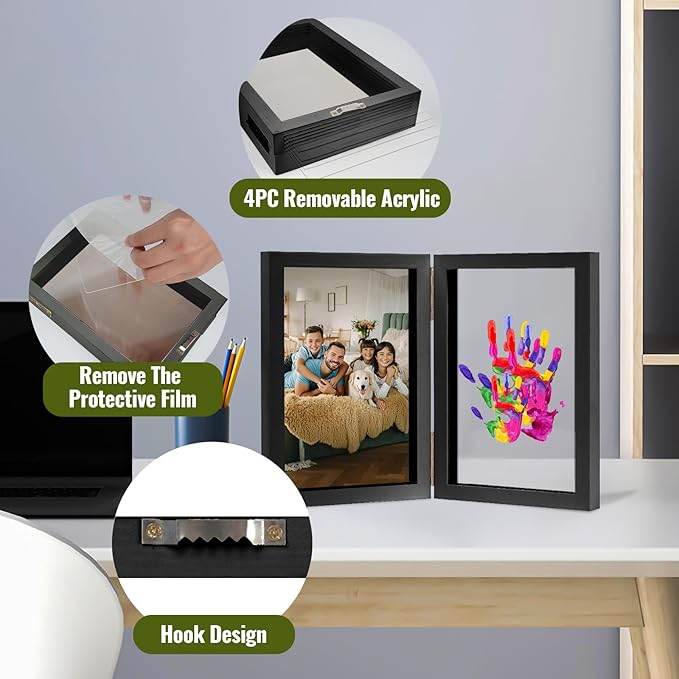 • 【DIY GIFT KIT】This baby hand and footprint kit comes with a custom black folding frame (Can store 1 or more family photos according to your needs), 4 transparent sheets (warm reminder: peel off the protective film of each transparent sheet before use.), 5 types Washable paint (red, yellow, blue, white, green), 1User Manual, a brush, a Hanging twine and a black marker. Assembled dimensions: 7.7" x 2.4" x 11.2"