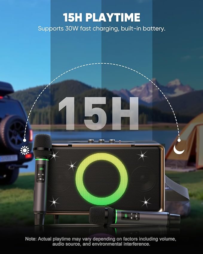 • 15H LONG PLAYTIME: Big & Loud Speaker: 15-hour battery life + 30W fast charging (fully charged in just 2.5 hours)! Bluetooth 5.3 ensures smooth music streaming, ideal for camping, backyard parties, and birthday celebrations.