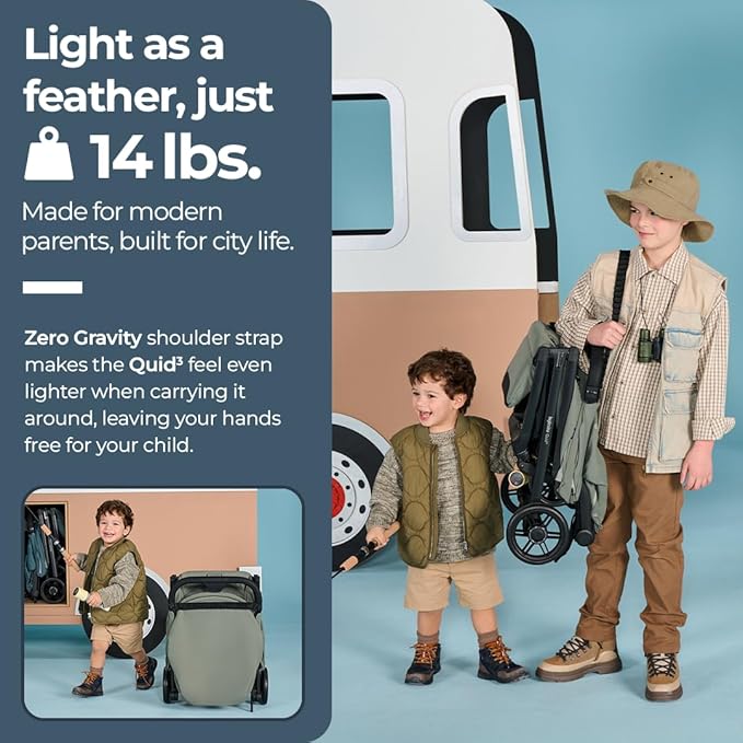 • COMPACT DESIGN & 1-HAND FOLD: The Quid³ stroller weighs only 14 lbs and has an effortless 1-hand folding system for your convenience. The kickstand feature allows the Quid³ stroller to stand on its own when folded, keeping your baby and stroller clean.
