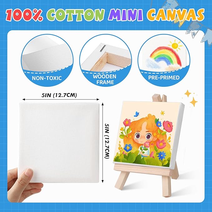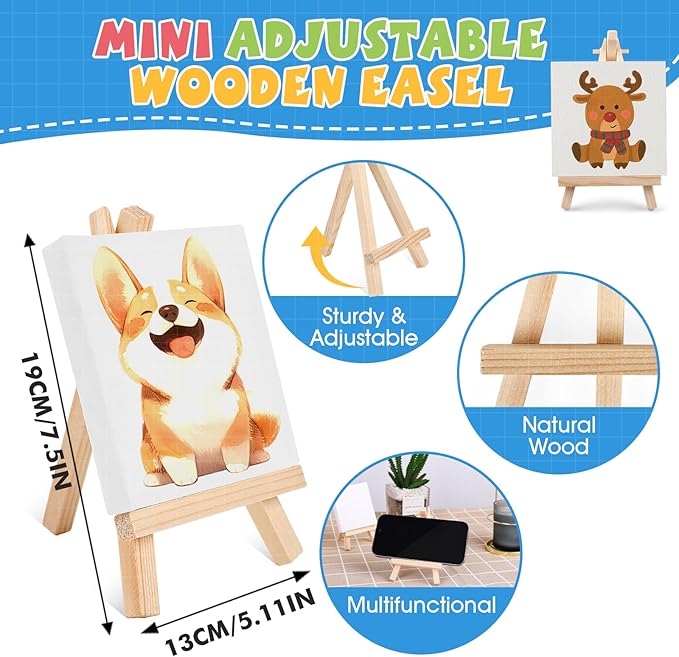 • 【 Mini stretched canvas and easel】: The 8 set mini acrylic paint set provide 5 x 5 inch small canvas with 7.5 inch mini wooden display easel. Kids can show their creations anywhere. Our mini canvas are safe and non-toxic, making them perfect for kids to use. These small easels are sturdy,can be used to hold photos, phones and more.