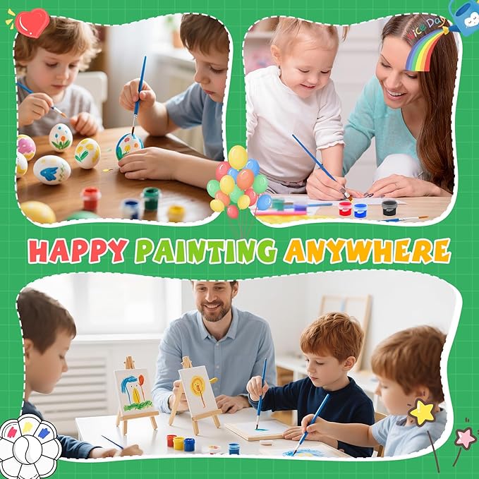 • 【 Mini stretched canvas and easel】: The 24 set mini acrylic paint set provide 5 x 5 inch small canvas with 7.5 inch mini wooden display easel. Kids can show their creations anywhere. Our mini canvas are safe and non-toxic, making them perfect for kids to use. These small easels are sturdy,can be used to hold photos, phones and more.