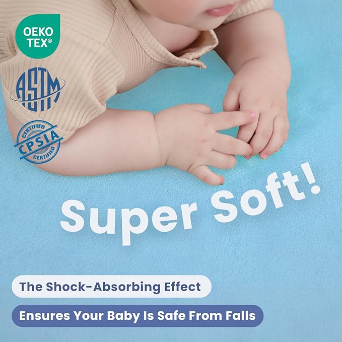 • 【SAFE FOR BABY】:Our light blue baby play mats can be used as playpens, transforming your kids' play area into a soft and safe adventure zone. Children will love rolling, sliding, and playing on our mats without you worrying about them getting hurt on hard floors. The activity play gym is also great for tummy time for little ones. Walking on it with bare feet feels heavenly! Plus, it passes CPSIA and ASTM tests, so you can use it with confidence and peace of mind
