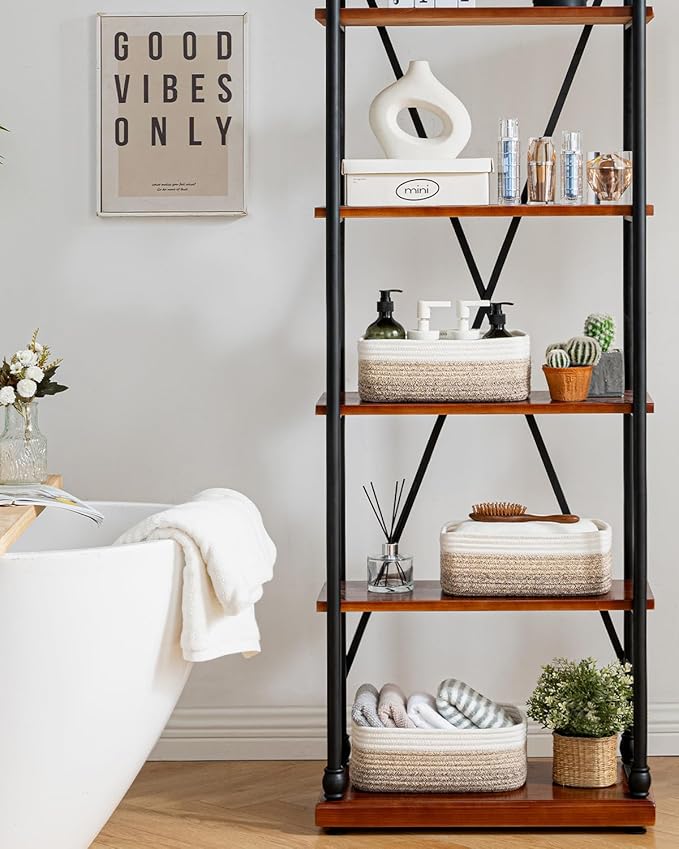 • [ Elegantly Designed to Match Any DΓ©cor ] Our small rope basket creates a minimalist appearance, and it adds a touch of warmth and texture to any room. The classic solid color design ensures seamless integration with your existing aesthetics, complementing any decoration. Perfect as decorative storage baskets for shelves, cabinets, and any open display space, making them a stylish and practical addition to any decor, enhancing the overall aesthetics of your room