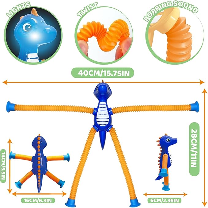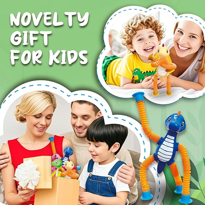 • πŸ‘Όβœ¨ 【FUN SENSORY TOYS FOR KIDS】: These all new design brightly colored dinosaur animal pop tube toys offer more than meets the eye. With pop tube arms and legs featuring uneven textures and satisfying popping sounds, they engage kids' senses and promote motor skill development. The added telescopic suction cup limbs enable them to attach to flat surfaces like windows or desks, introducing a new dimension of play and tactile sensation.