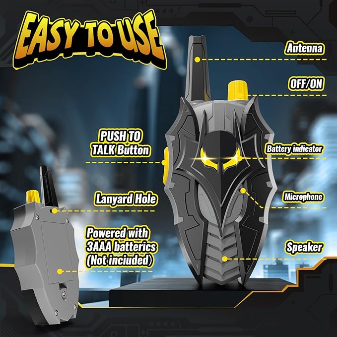 • Eye-Catching Design: Our walkie talkies for kids come in a striking design that’s sure to captivate children. With cool flashing eye lights and a bold, sleek look, it’s not just a tool for communication but also a toy that kids won’t want to put down. These walkie talkies bring excitement to any adventure, making them an ideal choice for toys for kids 3-5 4-6 6-8 8-12 boys.