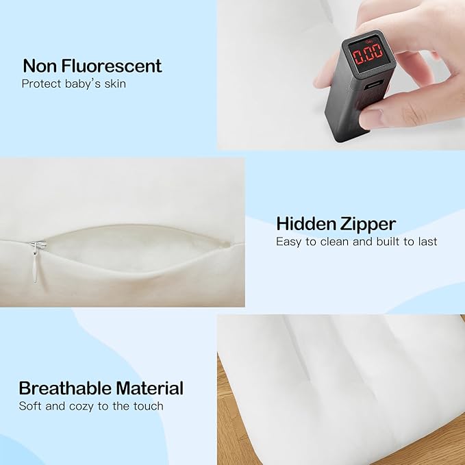 • Material: We chose to use organic cotton to keep our products from containing harmful chemicals. For our fills, we use polyester fiber with zero added chemicals or flame retardants. This baby lounger is CPC, AAP, and CPSC certified, ensuring that it meets rigorous safety standards. With its thoughtful design, providing a reliable space for your little one to explore and interact with family