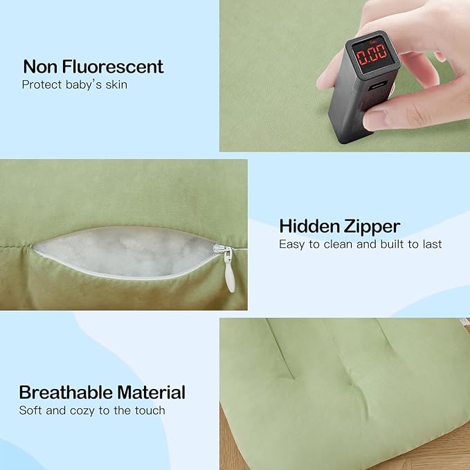 • Material: We chose to use organic cotton to keep our products from containing harmful chemicals. For our fills, we use polyester fiber with zero added chemicals or flame retardants. This baby lounger is CPC, AAP, and CPSC certified, ensuring that it meets rigorous safety standards. With its thoughtful design, providing a reliable space for your little one to explore and interact with family