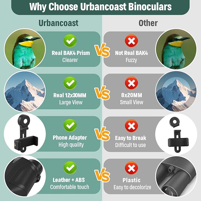 • 12X30 POWERFUL HIGH-DEFINITION BINOCULARS : With 12x magnification and 30mm large objective lens, Urbancoast small binoculars for adults and kids deliver 367ft/1000yds large field of view with clear and crisp images,letting you look father and see wider.The large eyepiece promises an immersive, comfortable viewing experience. With BAK4 prism and FMC lenses.