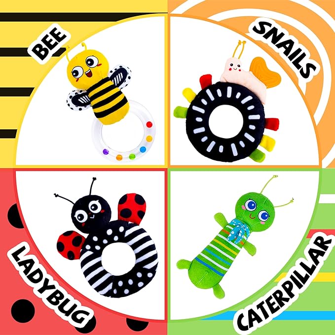 • 【Multi-Sensory & Cognition Development】The sounds that capture attention and aid in auditory development. The toy helps develop tactile sensitivity and visual processing. The vibrant colors of the caterpillar and bee, along with the high-contrast black and white patterns of the snail and ladybug, are specially chosen to aid in your baby's visual acuity. It is a perfect learning and educational toy for babies to develop cognition.