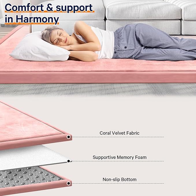 • ๐ŸฃSAFE & COMFY: Our baby play mat is made of 100% coral velvet material and filled with high-quality 3.5cm thick memory foam,eco-friendly and durable, providing a safe and comfortable play area for your babies, without worrying about them hurting themselves on hard floors.The surface of this tummy time mat is velvet cover, which is not only soft and comfortable to touch, but also has a good cushioning effect.