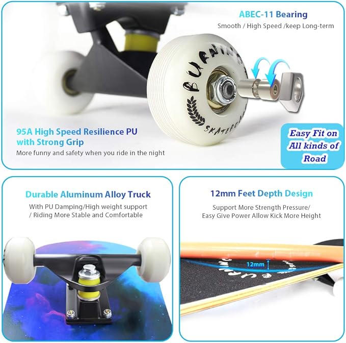 • 【STICK MATERIAL】 7-Ply 31" L x 8" W x 4" H Maple Wood make the wood deck very durable and can bear 220lbs weight , Super soft PU Wheels cut off damping when you riding , Alloy Truck provide more steady structure for skateboard, ABEC-11 Bearings make the wheels turn around more smoothly , Pattern: Heat Transfer(which was printed onto the board,not a sticker.) make the pattern durable a long time.