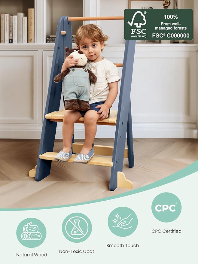 • Safety Net Protection: When baby plays in the kitchen, the safety net protection of this folding stool ensures parents no longer worry about side flips! Equipped with detachable safety nets, flip - up guardrails, and anti - slip pads, it forms all - around protection. This foldable toddler tower is certified by CPSC and coated with food - grade non - toxic varnish, it ensures safe contact for babies.