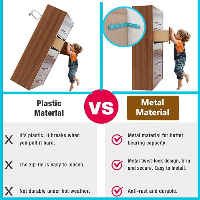 • Package Includes(furniture anchors for baby proofing): Furniture anchors Use the hardware components included in the package, and baby furniture anchor Package Includes:All parts made of high quality steel, includes4 pack Stainless steel bracket, 8 pcs Long wall screws, and 16 pcs Wall anchors 8pack expansion nails plugs y to install with a screwdriver or drill driver.