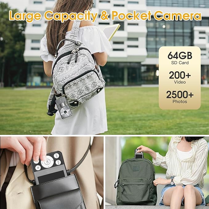• 【Portable & Versatile Features】The portable camera is slim enough to fit in your pocket. It with rear HD selfie mirror, you can see your beautiful self from the selfie mirror, making your photos more natural and beautiful. And it supports H.264 encoding, MOV format, videos or photos uploaded to mobile phones or computers can be played directly, share beautiful moments anytime, anywhere.
