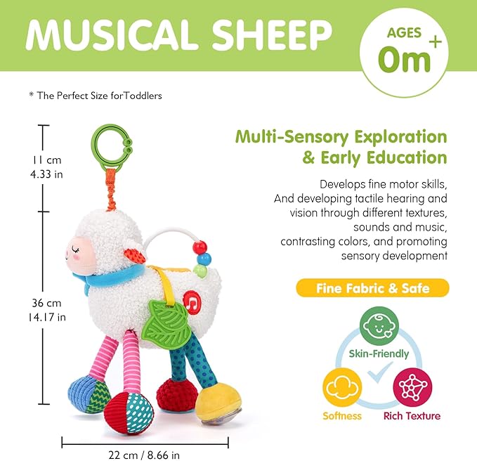 • All-in-One Sensory Experience for Early Development : From 0 months onward, this plush musical sheep offers an all-in-one sensory playground: soft plush textures, crinkly ears, gentle rattles, peekaboo flaps, a baby-safe mirror, and 4 melodies to help soothe or entertain your Baby. These features are thoughtfully designed to engage baby’s touch, hearing, and vision—boosting sensory awareness, early language skills, and brain development in a fun and gentle way