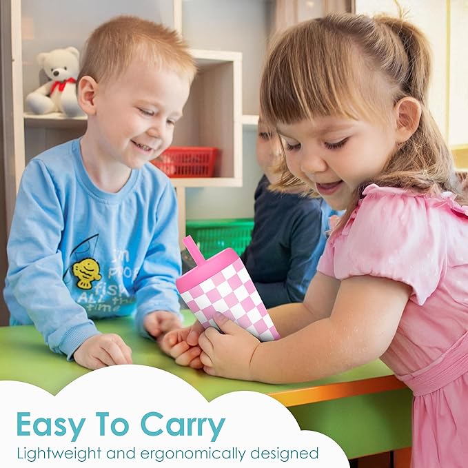 Kid Insulated Stainless Steel Tumbler with Silicone Straw, 12oz Sippy Cup for Kids (Pink Checkerboard)