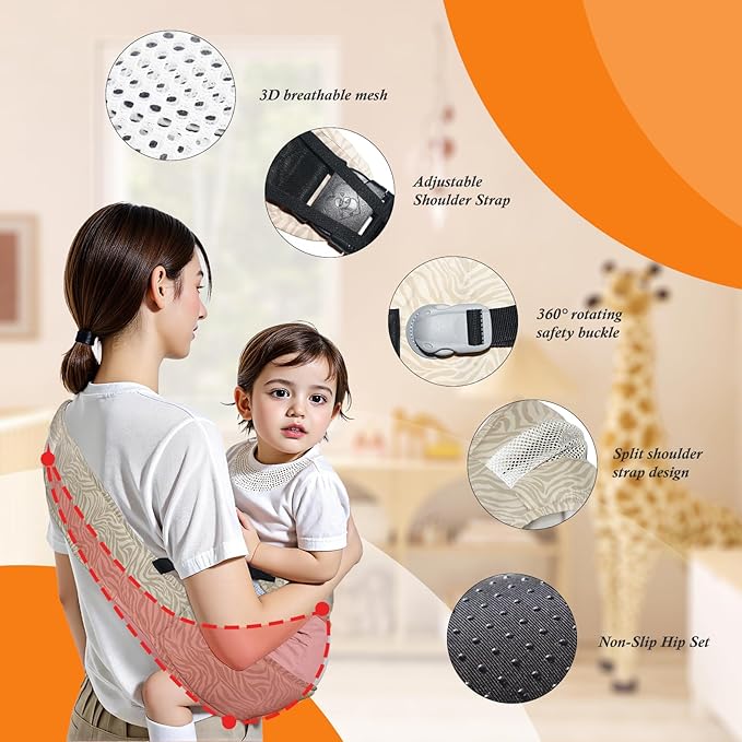 • 360°Safety and Double Protection:Equipped with a 6cm mountaineering-grade 360° rotating safety buckle and made of 600D high-density Oxford cloth, this baby carrier sling is slip-resistant and extra durable. The 10cm anti-slip safety rope provides additional protection, ensuring your child’s safety, making it an ideal toddler hip carrier for both everyday and outdoor use.