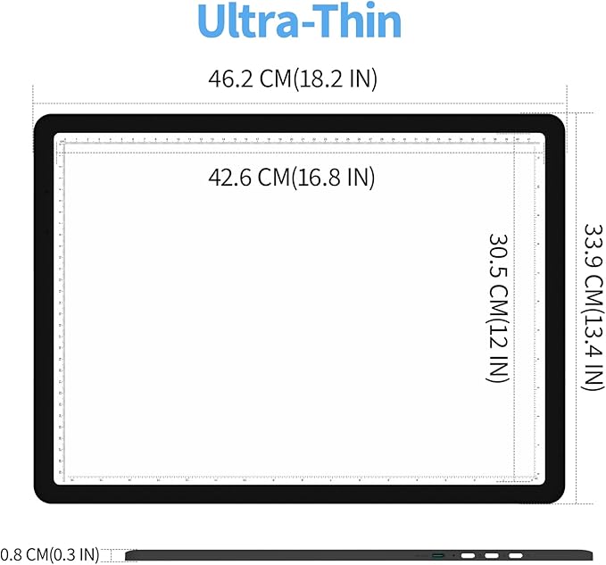• [Dual Measurement System & Spacious A3 Workspace]: CM/INCH dual scales adapt to global crafting standards.The size of tracing light box is 18.2 x 13.4 in (46.2 x 33.9 cm). Generous 16.8 x 12 in (42.6 x 30.5 cm) illuminated area fits A3 paper, diamond painting kits, and tattoo stencils. Ultra-slim 0.3 in (0.8 cm) profile slips into portfolios. Note: Surface is scratch-resistant but avoid sharp tools