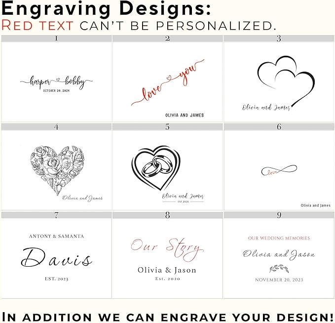 • Customizable: this acacia nostalgia box for memories can be engraved with various designs offered adding the couple's names, couple's names and dates to make it unique. We’ll use the font style showcased in the photos. Additionally, it can be engraved inside(different font options), on the other lid's side, to create a surprise message for the recipient