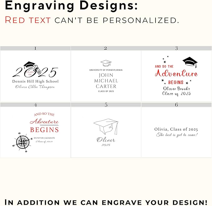 • Make It Personal: Customize your 2025 graduation box with a name, "Class of" year, and school name. We’ll engrave it in the font style shown in the photos. You can also engrave a message on the inside lid (different font choices available). Create a truly special and memorable gift!