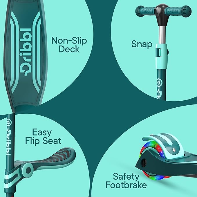 Aqua 3 Wheel Scooter with Seat for Kids – Light-Up LED Wheels, Adjustable Handlebar and Seat, Smooth PU Wheels, Wide Anti-Slip Deck, Rear Foot Brake – Toddler Outdoor Toys for Ages 2+