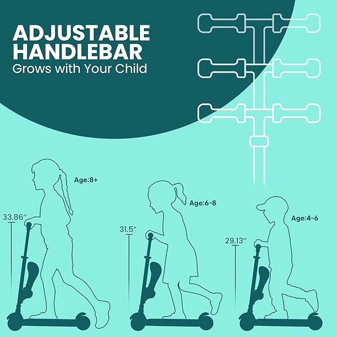 • Grows with Your Child – The adjustable T-bar handlebar offers four height settings (26.77’’, 29.13’’, 31.5’’, and 33.86’’ inches), making this kids 3 wheel scooter the perfect ride for toddlers as young as 2 years old weighing up to 165 lbs.